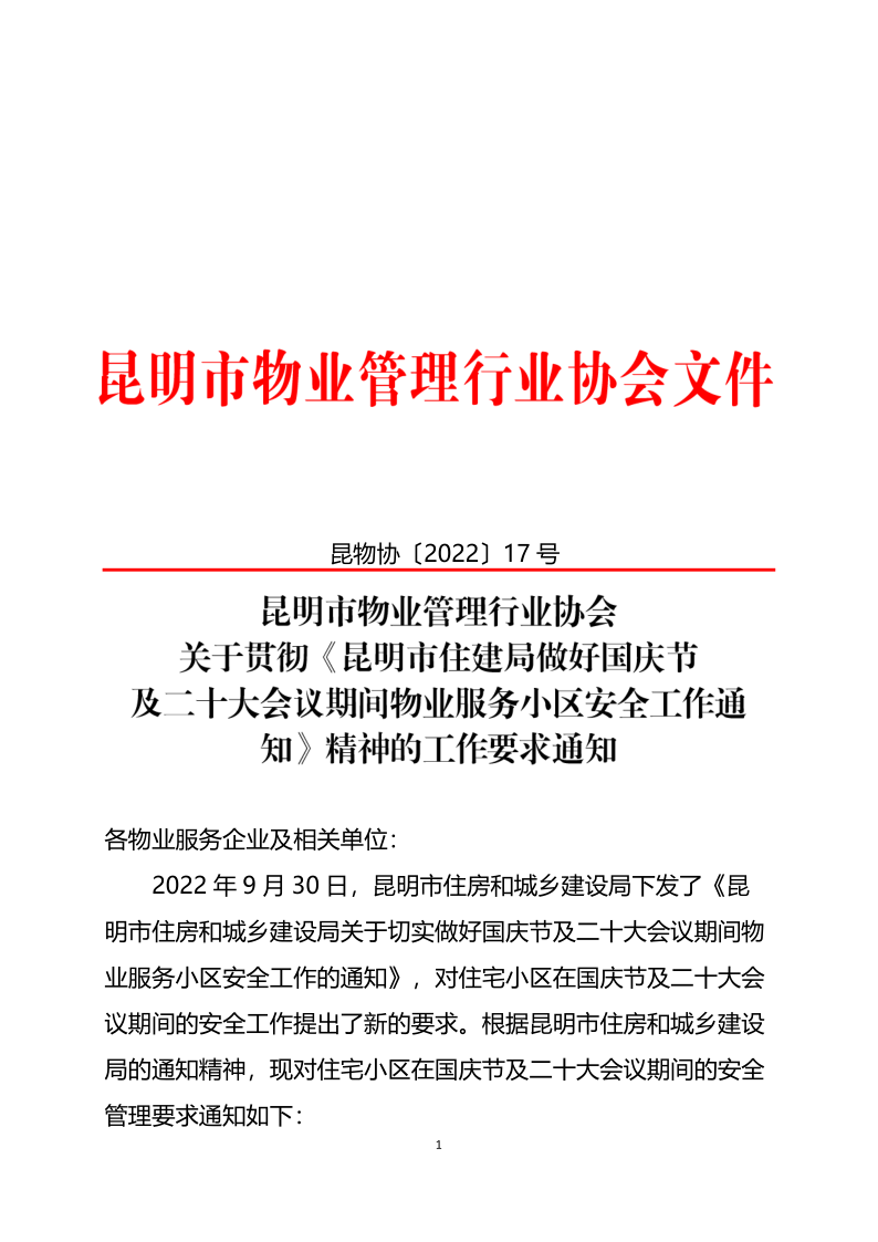 关于贯彻《昆明市住建局做好国庆节及二十大会议期间物业服务小区安全工作通知》精神的工作要求通知